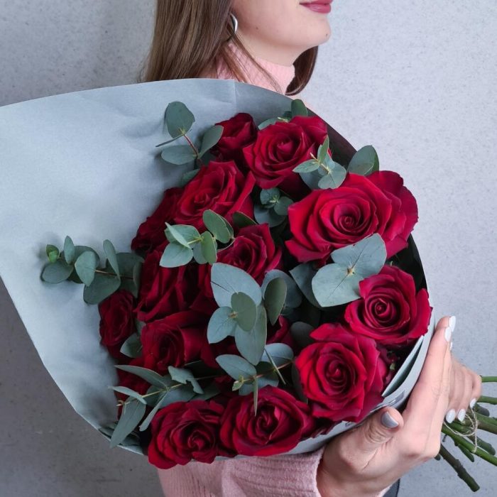розы эксплорер эквадор – 15 шт.Эвкалипт – 9 шт.Упаковка дизайнерская – 1 шт.