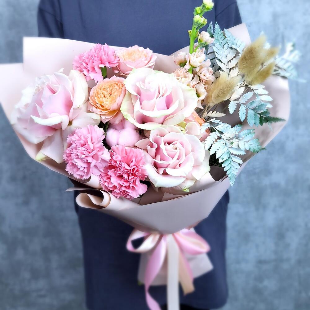 Маттиола – 1 шт.Папоротник – 1 шт.Хлопок – 1 шт.Роза Эквадор – 3 шт.Гвоздика – 3 шт.роза джульетта кустовая – 1 шт.