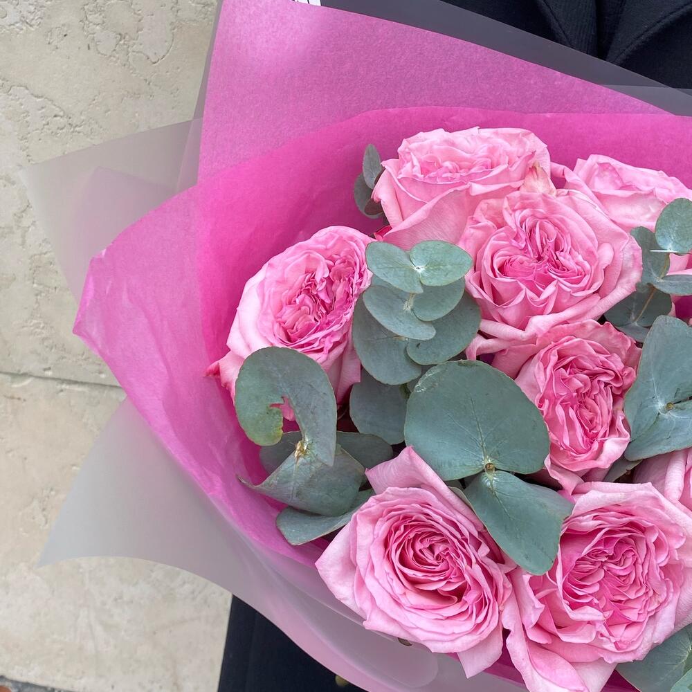 Эвкалипт – 5 шт.Лента атласная белая – 1 шт.Матовая пленка – 2 шт.Тишью розовая – 1 шт.роза pink o’hara – 9 шт.