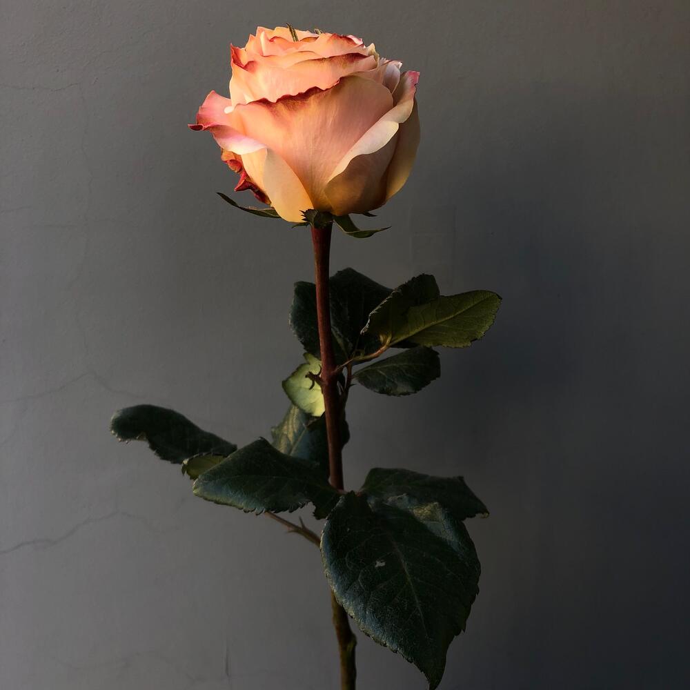 Уникальная персиковая роза с нежными завитками и рюшами, с небольшой зеленой серединкой, которая становится более заметной при распускании.высота 50-60см