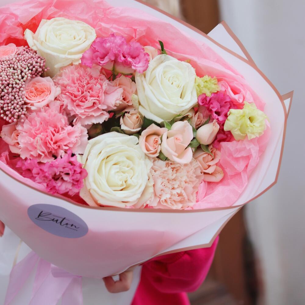 Роза белая пионовидная – 3 шт.Диантус сортовой – 3 шт.Озотамнус – 1 шт.Лизиантус розовый – 1 шт.Роза кустовая – 3 шт.Упаковка дизайнерская – 1 шт.