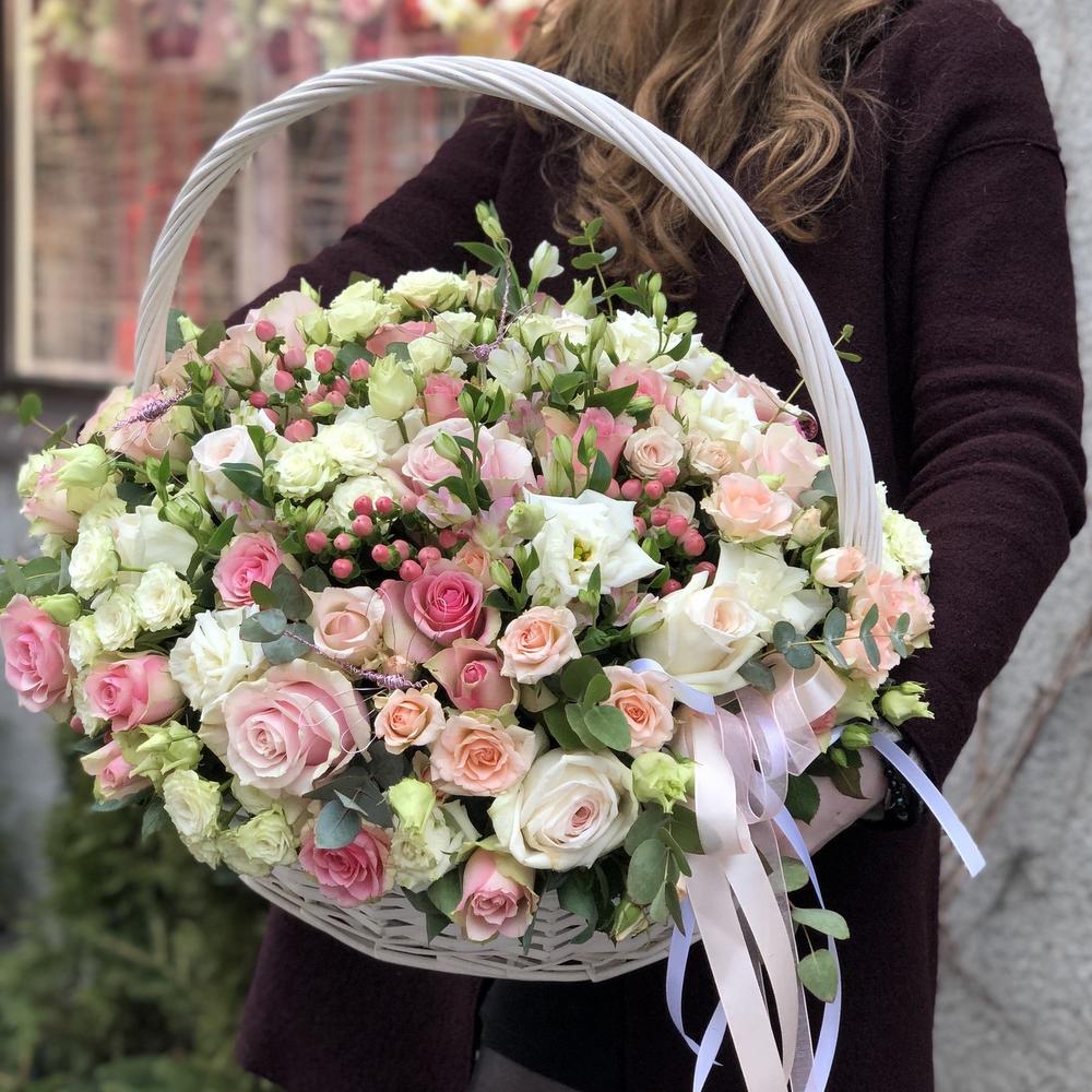 Лизиантус – 15 шт.Роза пионовидная – 11 шт.Роза кустовая – 15 шт.Хиперикум – 7 шт.Фисташка – 10 шт.Корзина плетеная – 1 шт.Оазис флористический – 3 шт.Лента атласная – 3 шт.
