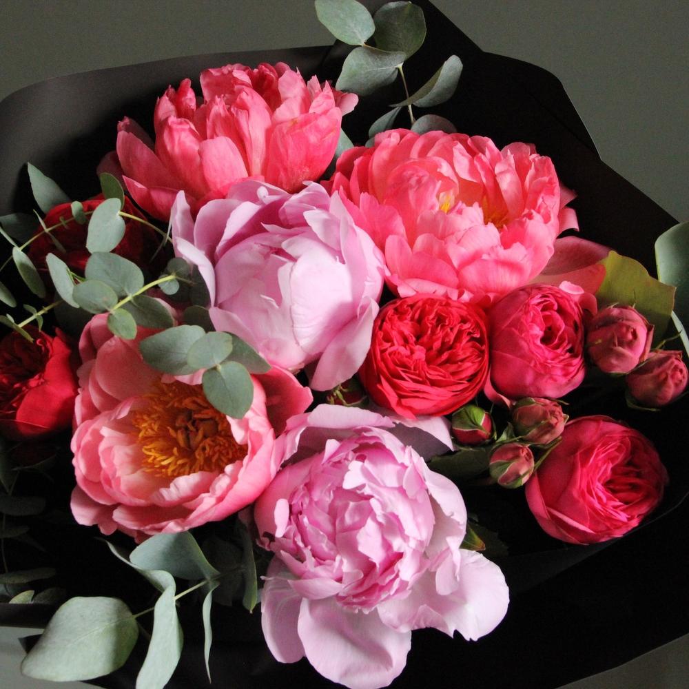Пион – 5 шт.Эвкалипт – 3 шт.Роза пионовидная кустовая – 4 шт.Упаковка дизайнерская – 3 шт.шнур декоративный – 1 шт.