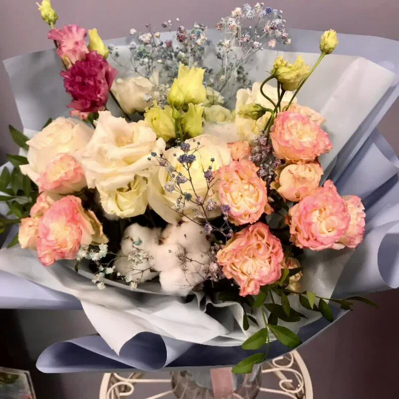 Роза белая – 3 шт.Роза кустовая – 3 шт.Хлопок натуральный – 3 шт.Гипсофила – 2 шт.Эустома – 2 шт.Фисташка – 3 шт.Упаковка дизайнерская – 1 шт.Лента атласная – 1 шт.