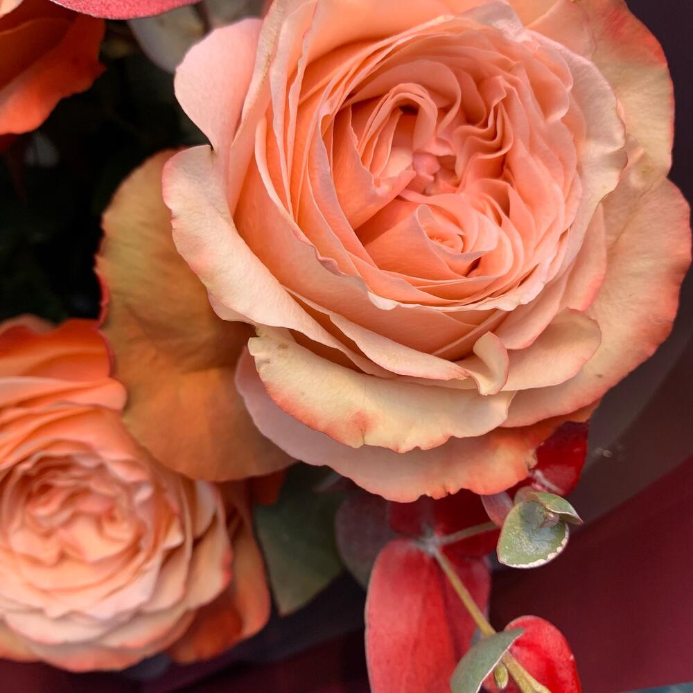 кахала роза пионовидная – 3 шт.Эрингиум синий – 1 шт.эустома персиковая – 1 шт.Эвкалипт – 1 шт.