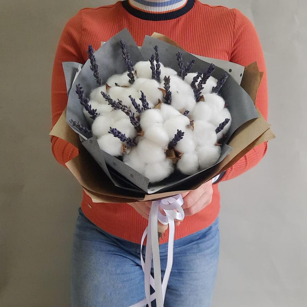 Хлопок натуральный – 11 шт.Лаванда – 15 шт.Упаковка крафт – 2 шт.Лента – 1 шт.