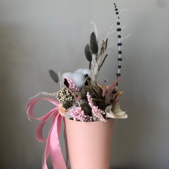 Стакан – 1 шт.Оазис для сухоцветов – 1 шт.Каапс – 1 шт.озатомнус – 1 шт.Ковыль – 1 шт.Лагурус – 3 шт.сорго – 1 шт.Папоротник – 1 шт.Лаванда – 1 шт.