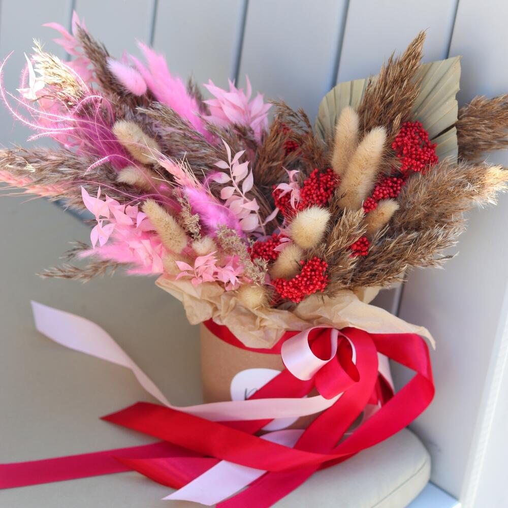 камыш декоративный – 7 шт.Лист пальмы – 1 шт.рускус стабилизированный – 1 шт.Озотамнус – 1 шт.Лагурус – 15 шт.Сетария – 1 шт.Колосья – 5 шт.Стифа – 1 шт.