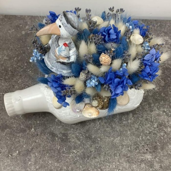 Кашпо керамическое – 1 шт.Фигурка декоративная – 1 шт.Лаванда (сухоцвет) – 30 шт.гортензия стабилизированная – 1 шт.лагурус пучок – 2 шт.Ракушки – 20 шт.