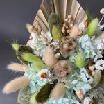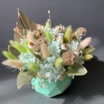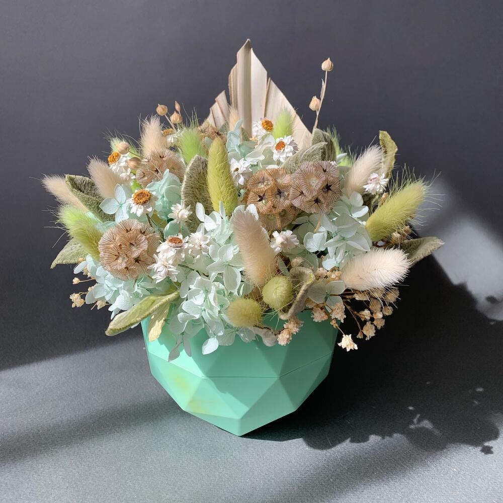 Кашпо – 1 шт.Оазис флористический – 1 шт.пика пальма – 1 шт.гортензия стабилизированная – 6 шт.роданте сухоцвет – 11 шт.стахис стабилизированный – 10 шт.Лагурус – 23 шт.Скабиоза сухая – 5 шт.