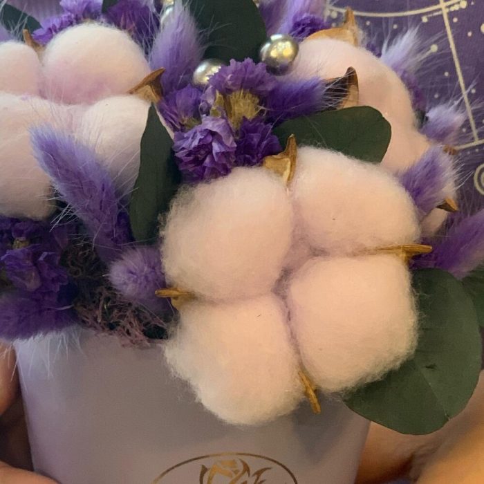 Хлопок – 3 шт.Лагурус (сухоцвет) – 25 шт.Статица синяя – 5 шт.Кашпо – 1 шт.Эвкалипт стабилизированный – 1 шт.