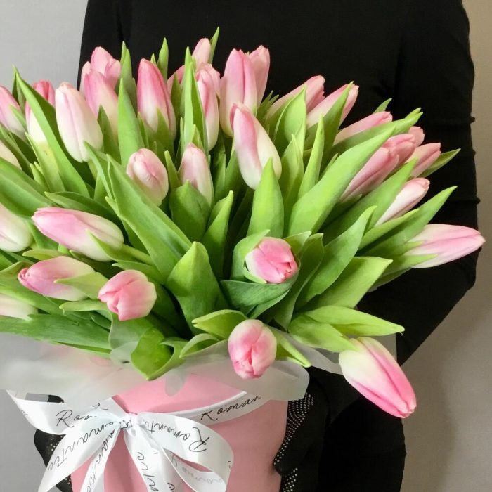 Тюльпан Голландский – 51 шт.Аквабокс – 1 шт.шляпная коробка 18*18 см – 1 шт.Пленка матовая – 1 шт.Лента атласная – 1 шт.