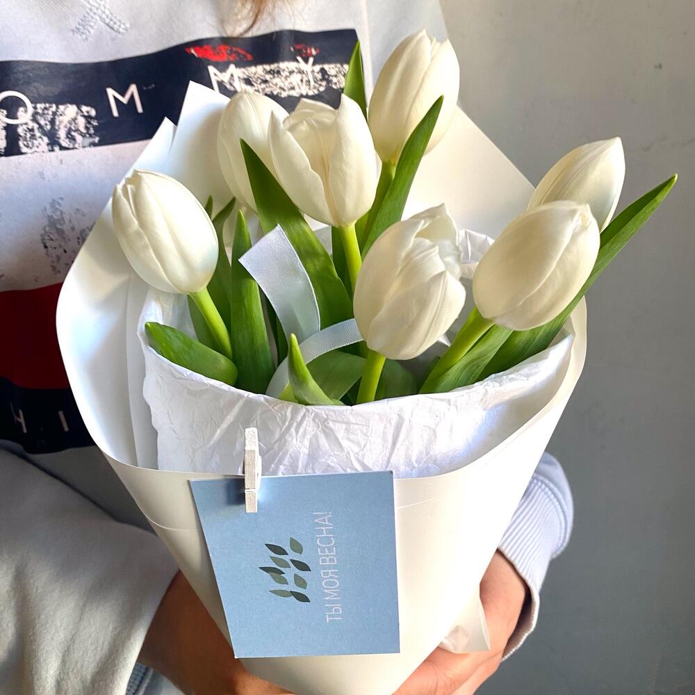 Лента атласная – 2 шт.Упаковка дизайнерская – 2 шт.Тюльпан белый – 7 шт.Тишью белое – 2 шт.подкормка для срезанных цветов – 1 шт.карточка для ваших пожеланий – 1 шт.