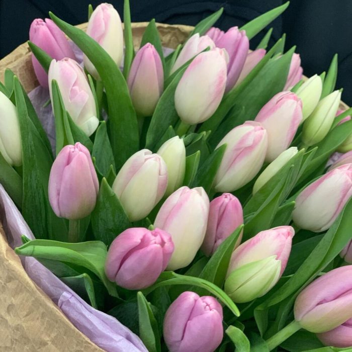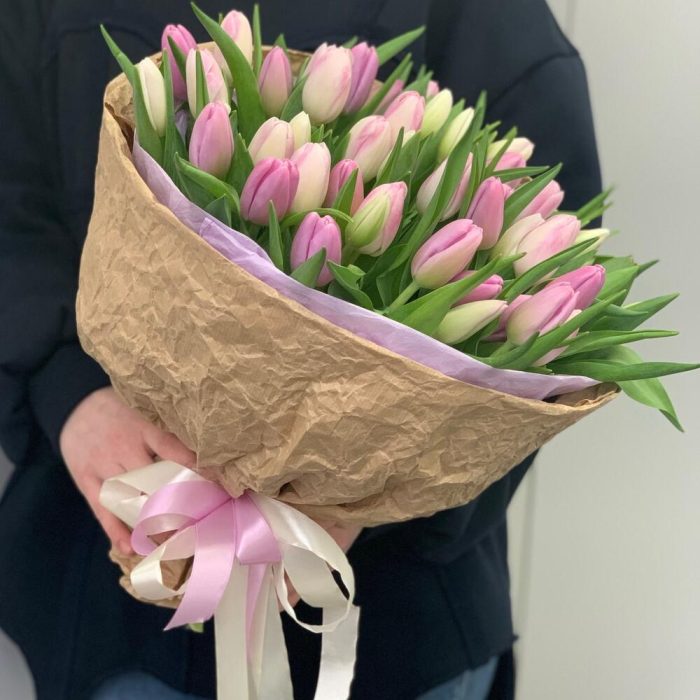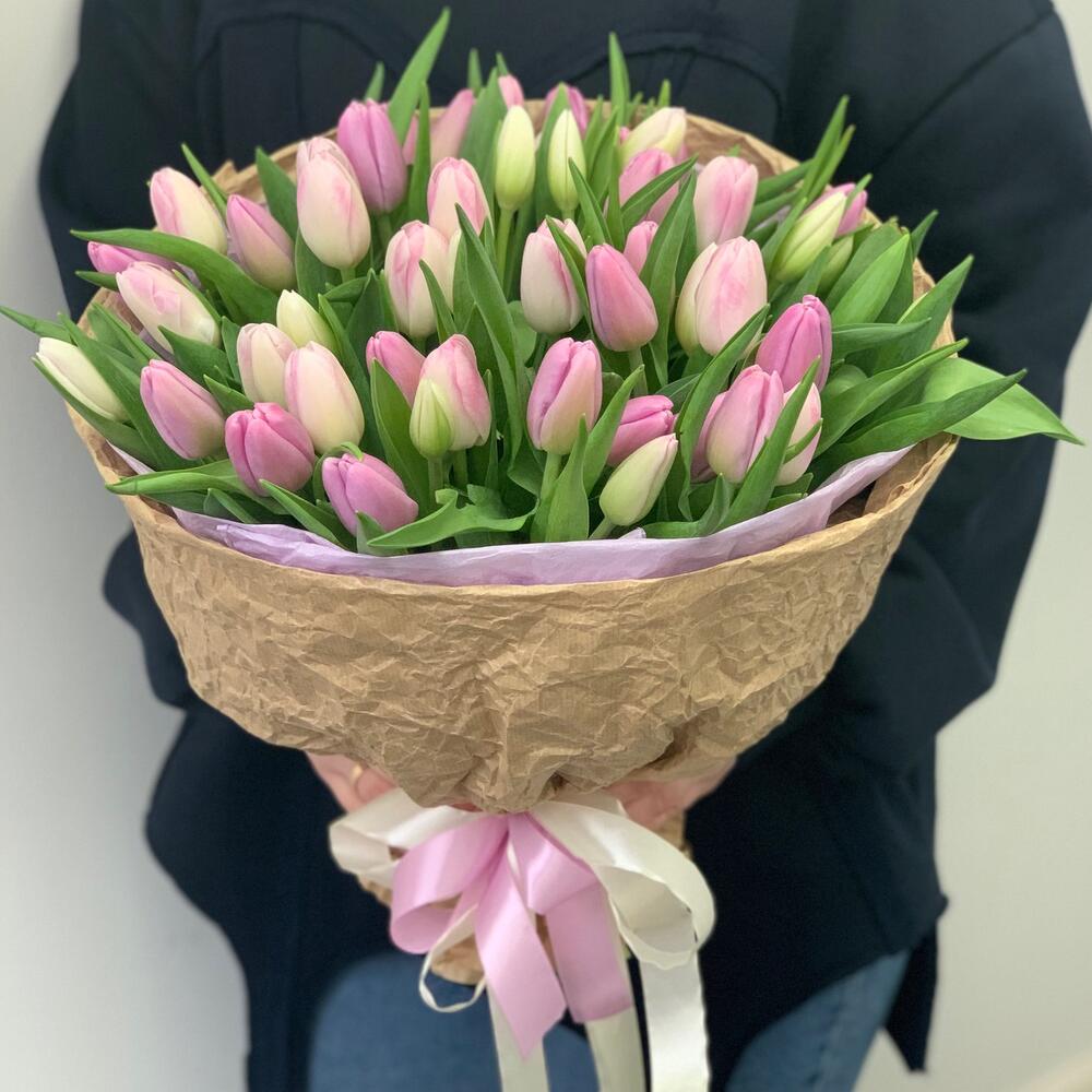 Тюльпан – 51 шт.Дизайнерская упаковка – 2 шт.Атласная лента – 1 шт.