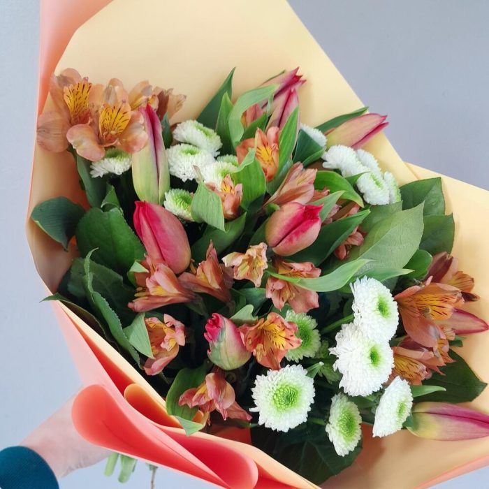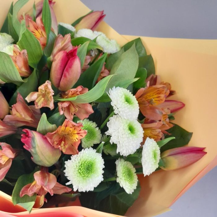 Альстромерия – 7 шт.Салал – 3 шт.Тюльпан – 9 шт.Лента атласная – 2 шт.Сантини – 3 шт.Упаковка дизайнерская – 3 шт.