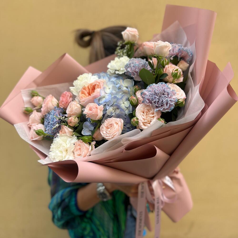 Альстромерии, Гортензии, Кустовые розы, Лизиантусы, Розы, Хризантемы